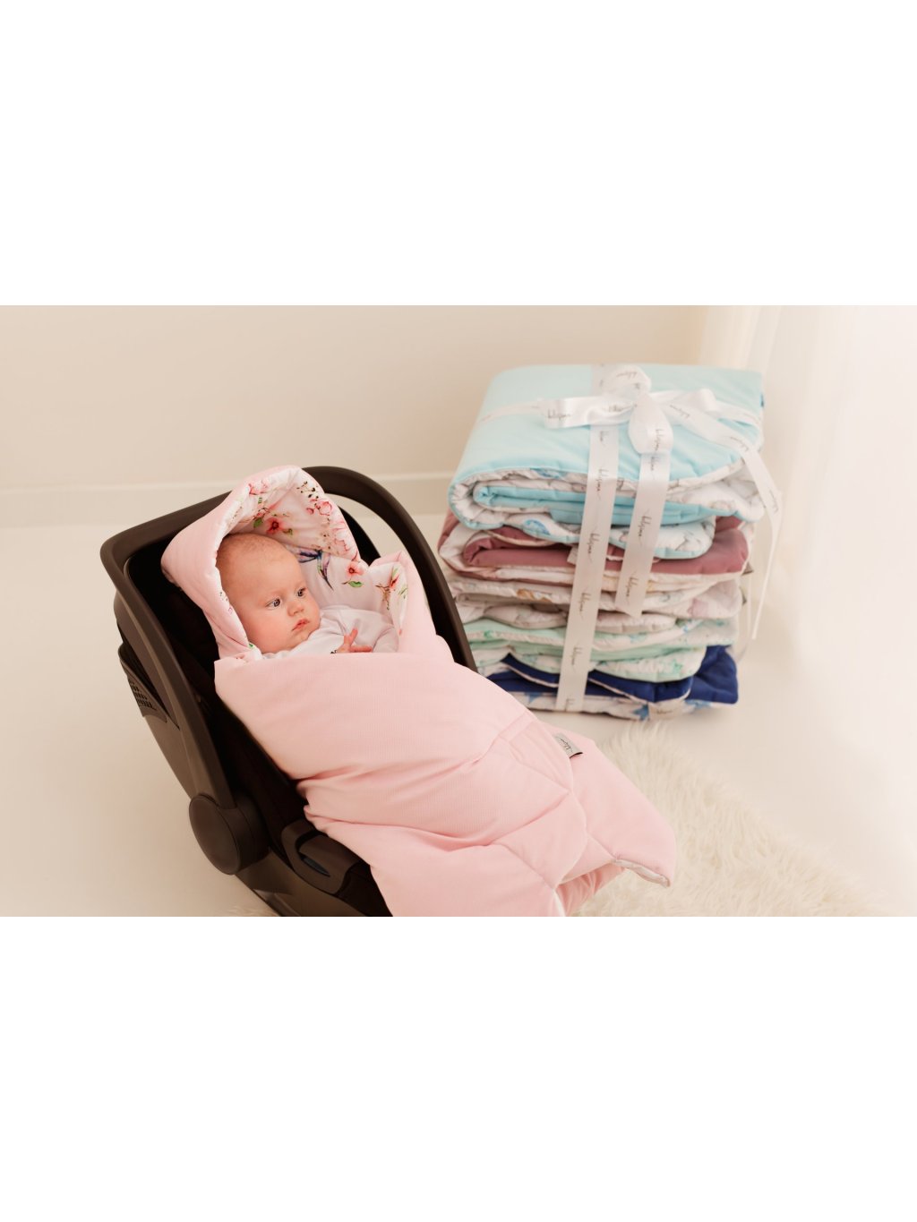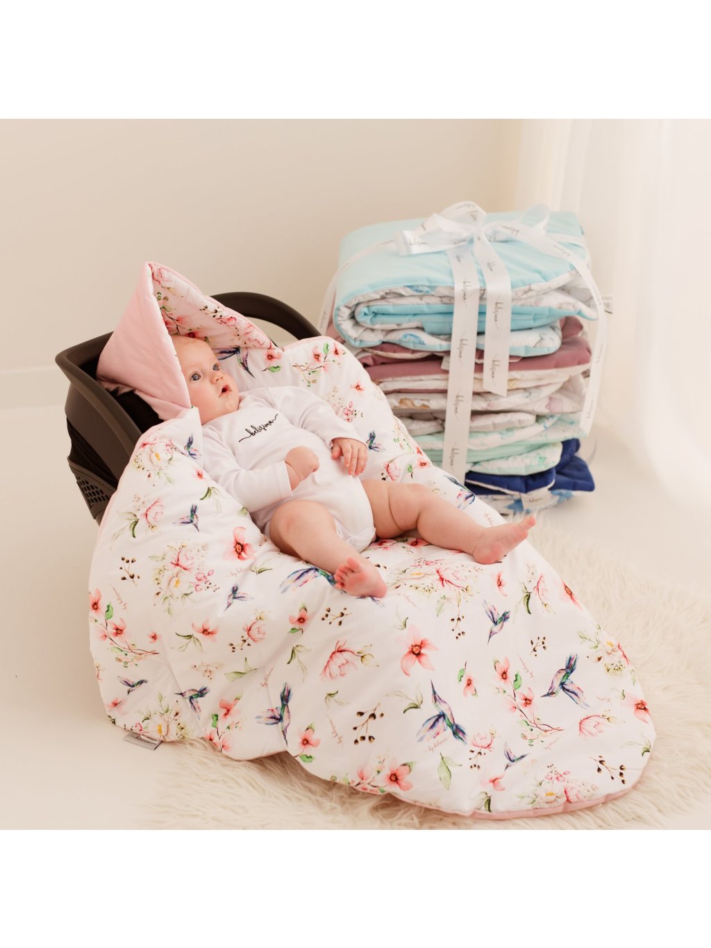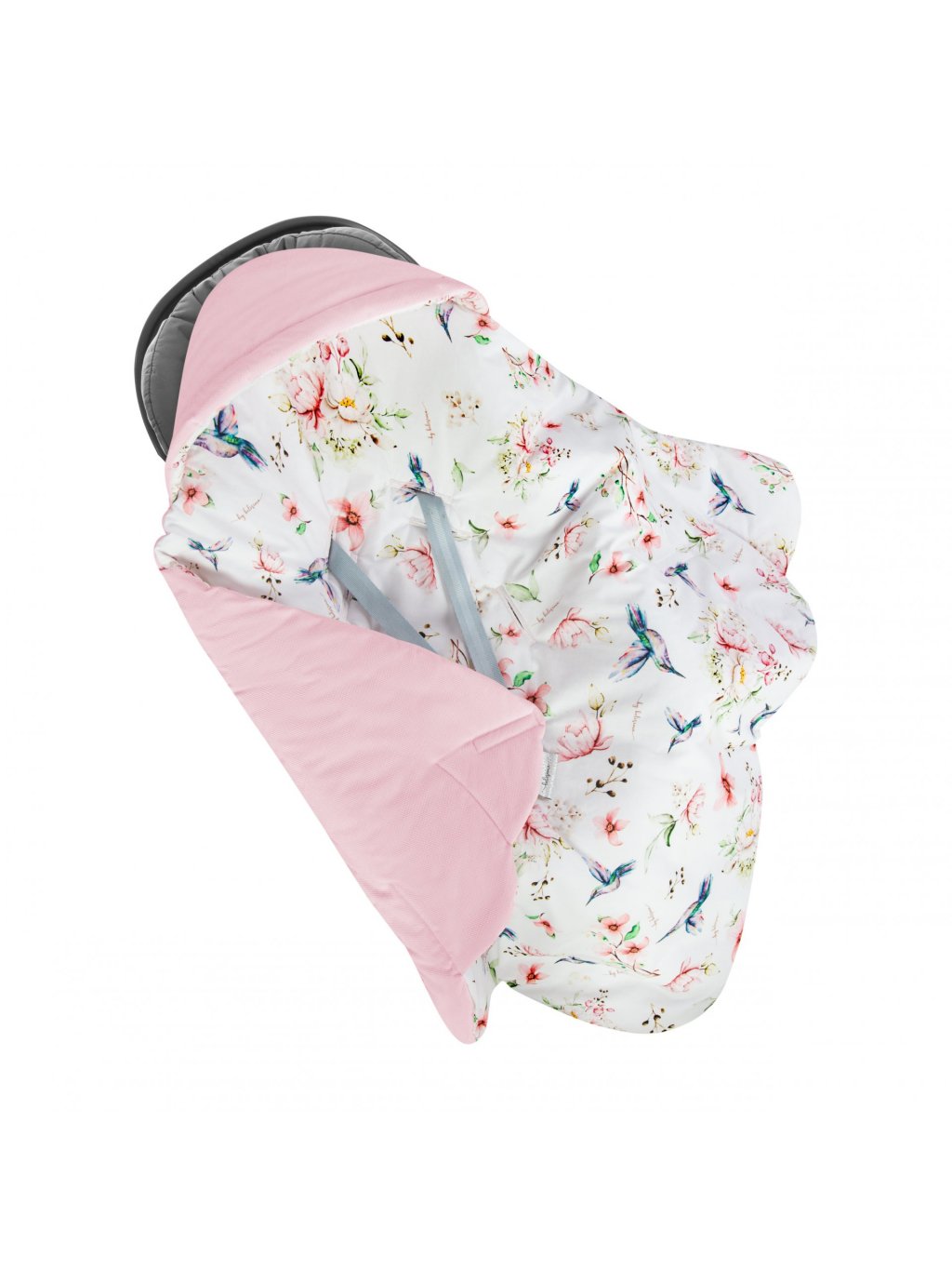 Teplučká obojstranná zavinovacia deka do autosedačky s motívom kolibríkov a praktickou kapucňou na hlavičku, aby dieťatko neprefúklo.