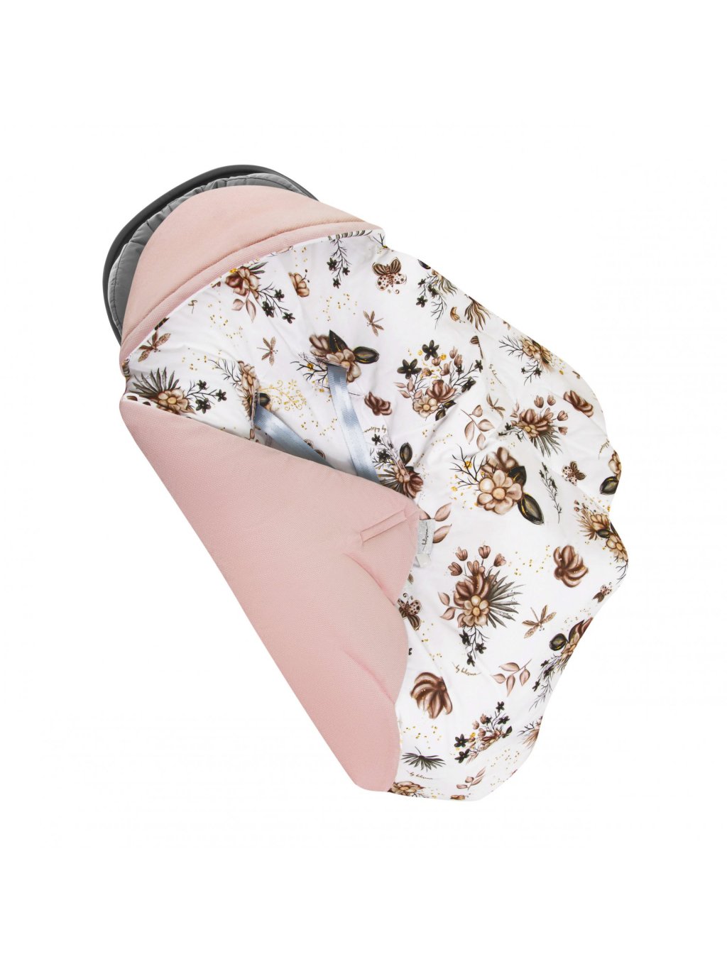 Teplučká zavinovacia deka do autosedačky s praktickou kapucňou na hlavičku, aby dieťatko neprefúklo. Deka je z vrchnej strany ružová a z vnútornej strany má motív kvetov.