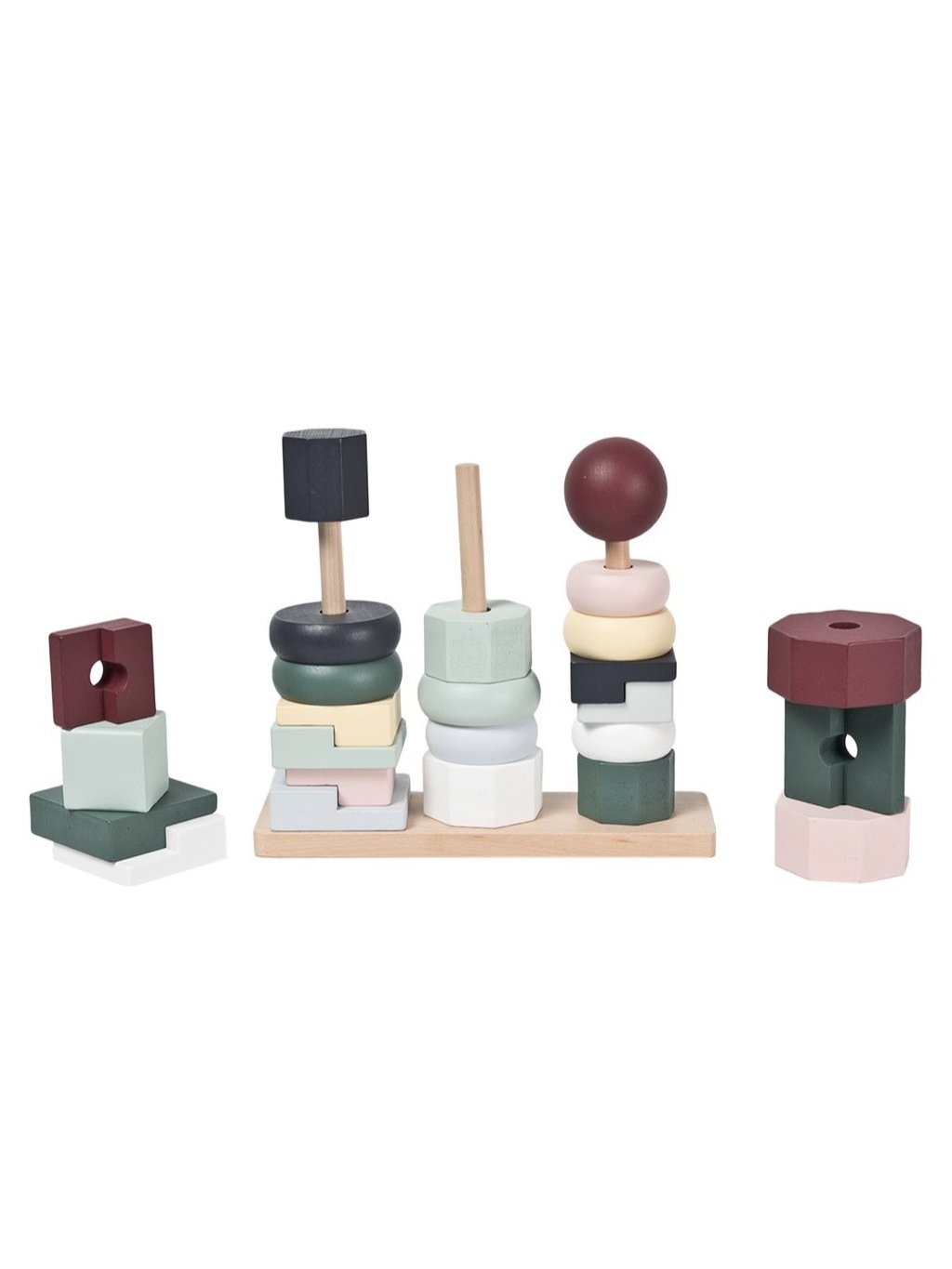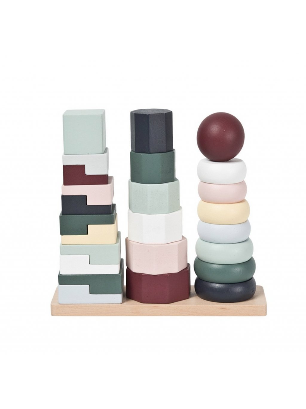 Skladacie pastelové kocky Stacking Buildings blocks podporujú jemnú motoriku, rozvoj koordinácie medzi očami a motorikou pre skvelé rozpoznávanie tvarov a farieb, pričom si deti natrénujú logické myslenie. V sade je 25 stavebných blokov, pričom hračka pozostáva z 3 veží, kde sa jednotlivé dieliky nasúvajú na tyčku. Každá veža sa skladá z iného geometrického útvaru a to kruh, osemuholník a štvorec..